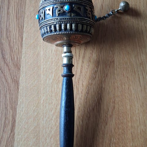 Indisk bedemølle der indeholder skriftrulle med mantraer. Mangler nogle jaspis- sten.