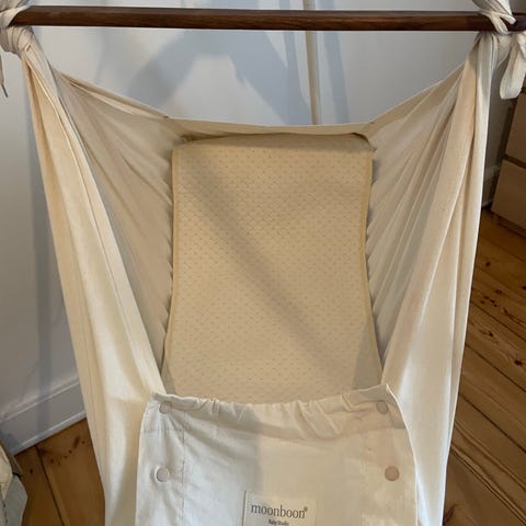 Moonboon slyngevugge i farven Earth købt i juli 2025. Brugt 4 måneder. Der er ingen tegn på slid og motoren fungerer som den skal. Inkl. moonboon motor og karmbeslag.