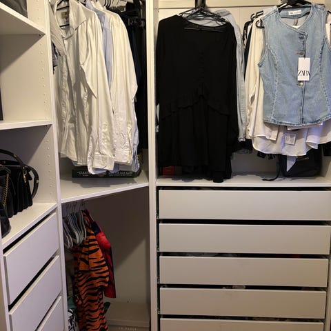 God inddeling med indbygget smykkeudtræk, to skuffer, bøjlestang og hylder