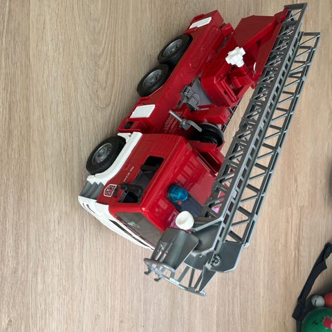 Bruder brandbil legetøj med udtrækkelig stige, rød og gul farve, plastmateriale. Designet som en brandbil til leg og simulation af brandmandsopgaver.