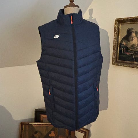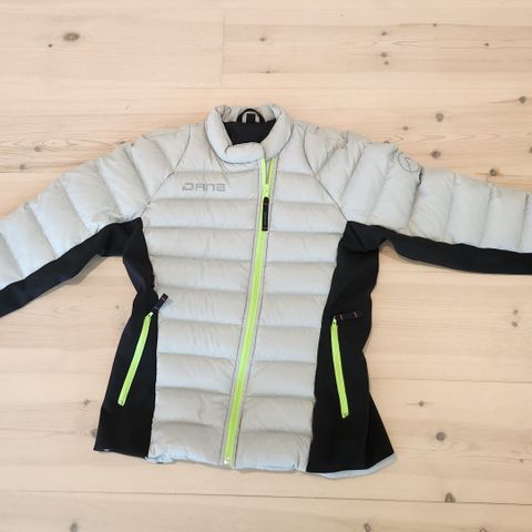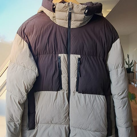 Lækker herre dunjakke i størrelse L med beige og brun farve. NB stor størrelse! Jakken har hætte og er fremstillet af materialer egnet til koldt vejr. Coating for at tage det værste regn og sne..