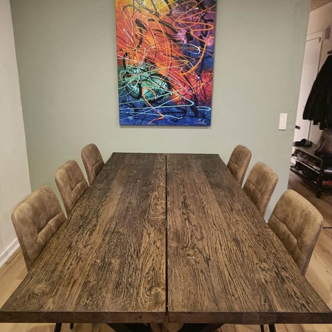 Har dette fine Eg Plankebord 2100x880 til salg inkl. 6x Lederstole med Eg Ben og Kobber.