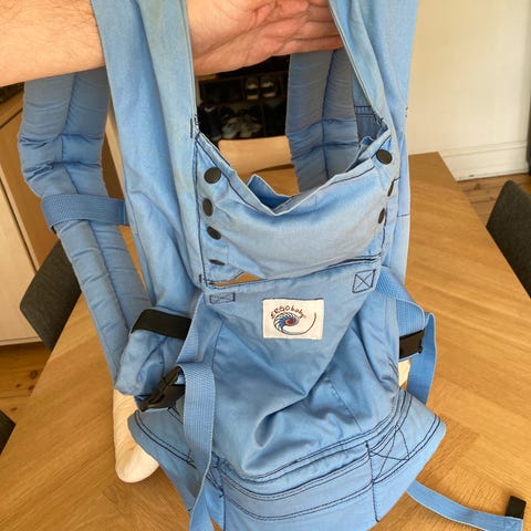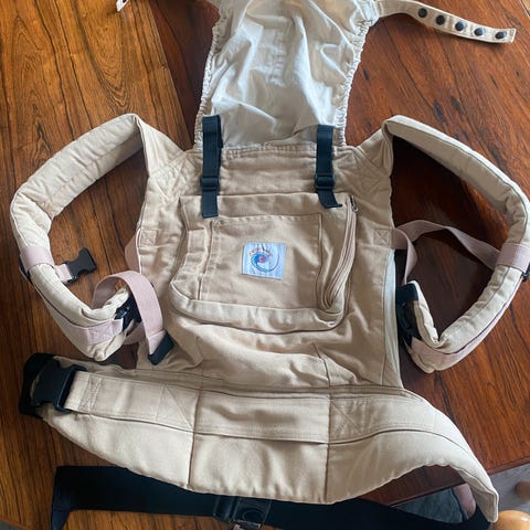Bæresele i olivengrøn farve. Fremstillet i holdbart materiale med justerbare stropper for tilpasning.