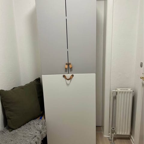 Brugt klædeskab med gardiner, en bøglestang, 4 hylder, 2 skuffer, trænger til at blive malet, ukendt mærke