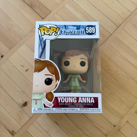 Funko Pop! Disney Frozen 2 Anna figur i samleræske. Figuren forestiller karakteren Anna fra filmen Frozen 2 og er designet i typisk Funko Pop! stil med stor hoved og detaljeret udseende.