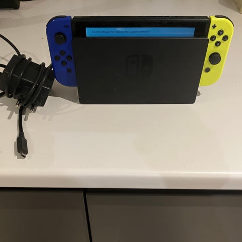 Nintendo Switch spillekonsol med tilhørende Joy-Con-controllere i rød og blå. Medfølgende tilbehør inkluderer oplader, dock, og transportetui. Spillet Mario+Rabbids - Sparks og Hope er inkluderet. Spillet er købt i Holland, men der tales og skrives på engelsk i spillet.