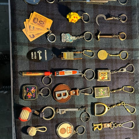 Samling af forskellige nøgleringe med forskellige mærker og designs. Nøgleringene varierer i form, farve og materiale, og kan bruges til at organisere nøgler eller som samlerobjekter.