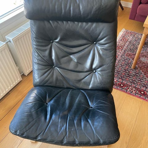 Siesta stol i brugt, men god stand. Ombetrukket med nyt sort læder. Kan afhentes på Bornholm eller i Ørestad efter nærmere aftale.