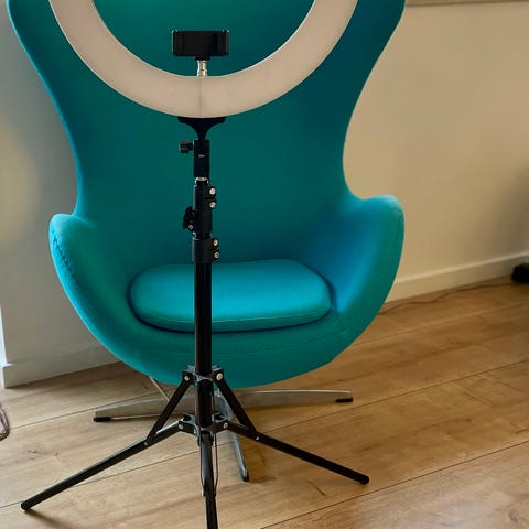 Ringlys med tilhørende stativ. Anvendeligt til fotografering, videooptagelse og belysning. Tulsluttes strømforsyning.