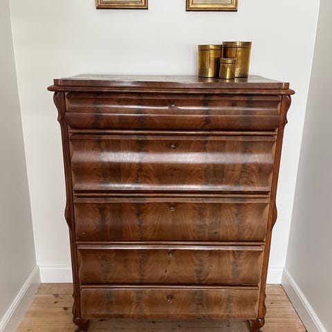 Kommode i mahogni med tre skuffer. Møblet har et klassisk design med metalhåndtag og ben i træ. Velegnet til opbevaring i stue, soveværelse eller entré.