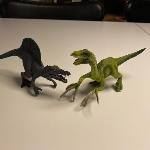 Schleich dinosaurer legetøjssæt bestående af 6 forskellige dinosaurfigurer i forskellige farver og størrelser. 3 stk ca 10 cm høje, 3 stk ca 3-5 cm høje..