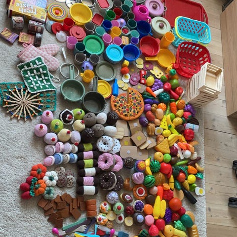 Legemad. Indeholder: skål, gryde med låg, pande, skål i metal, skål i rød plast.
