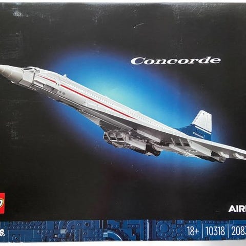 LEGO Concorde flymodel med detaljeret design, herunder cockpit og kabineinteriør. Modellen er hvid med sorte og røde detaljer og inkluderer et stativ med en informationsplade. Velegnet til samling og udstilling.
