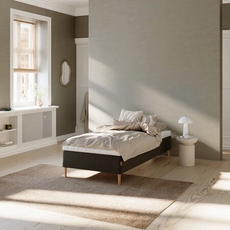 En boxmadras kræver ikke en sengebund eller lamelbund. Det eneste, du skal bruge, er en ny topmadras for at fuldende din seng.
