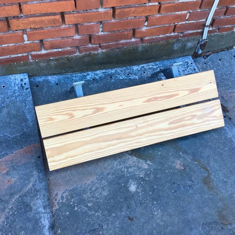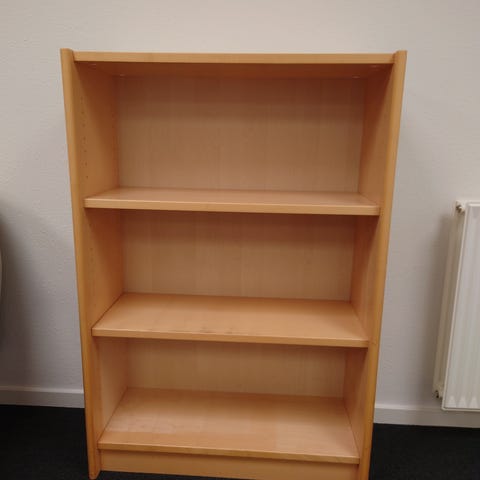 Træ hylde med metalophæng. Hylden har en rektangulær form og er designet til at blive ophængt på væggen ved hjælp af to metalophæng. Velegnet til opbevaring eller dekoration. mål højde 2 cm længde 113 cm dyb 22 cm