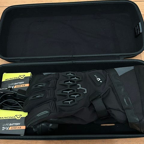 Handsker er brugt sparsomt, og der medfølger lader, som kan lade de genopladelige batterier på én gang. Udover at varme kan justeres på knappe på handsker, kan de også styres via Macna app ( gratis ) nypris er kr. 2400,00