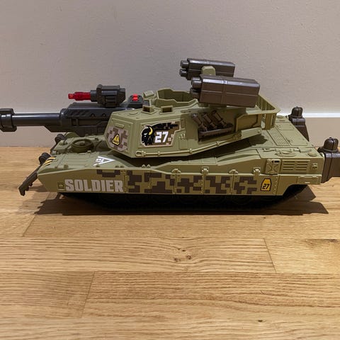 Legetøjs tank i G. I. Joe størrelse - 45cm x 20cm. Tydeligvis inspireret af en M1 Abrams men med en god dosis selvfortolkning ind over. Kanonen kan blinke og sige forskellige skydelyde.