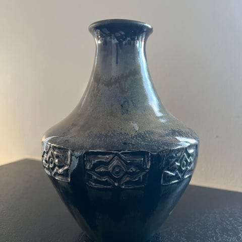Keramikvase. Strehla Keramik 9022 ? Højde ca. 10 cm. Diameter hul ca. 2,8 cm. Bredden på det bredeste sted ca. 10 cm