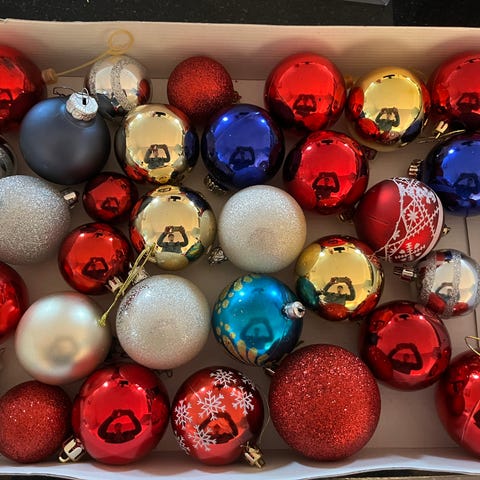 Bøtte med 5 grønne og 7 røde, 30 kr. 4 sorte julekugler ca. 8 cm 25 kr.
