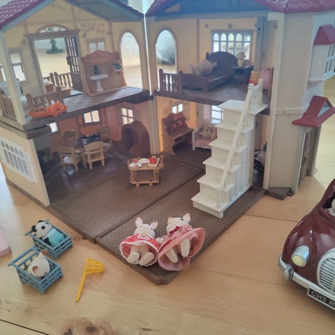 4 Huse, familier, tøj, møbler, diverse dimser; alt på billedet
