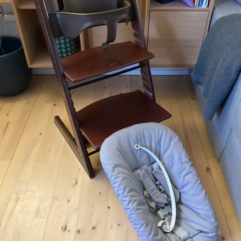 Fin Trip Trap stol med tilhørende baby indsats fra stokke samt newborn indsats. Enkelte mindre brugsspor