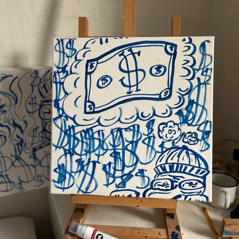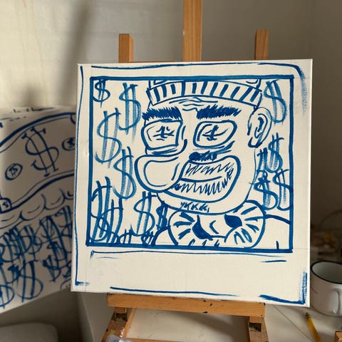 Maleriet har en hvid baggrund med blå tegninger og symboler, herunder et stiliseret ansigt og dollartegn. Og oven på Venstre lærel hjørne kan du se kunstnerens tilstand under prosessen. Bagpå maleriet er der signatur og titel. Kan bruges som dekorativ vægkunst.