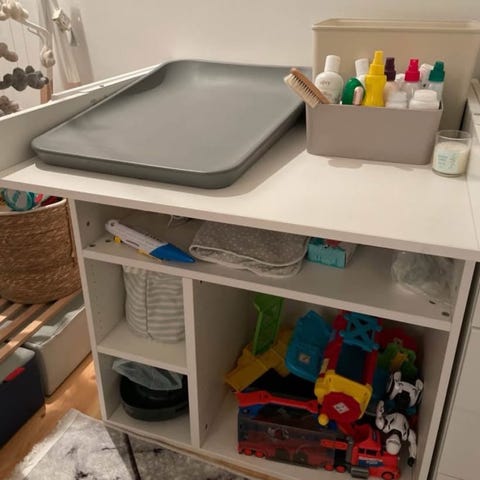 Babybjörn børnemøbel med farverige illustrationer, designet til børneværelset. Møblet har flere opbevaringsrum og er dekoreret med motiver, der inkluderer en rød og hvid svamp, en raket og forskellige figurer. Materialet og størrelsen er ikke specificeret.
