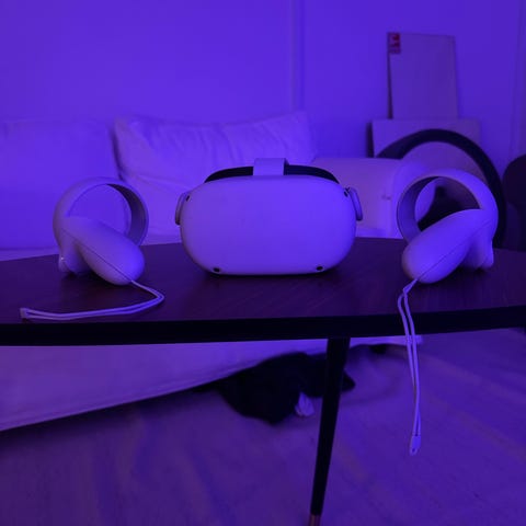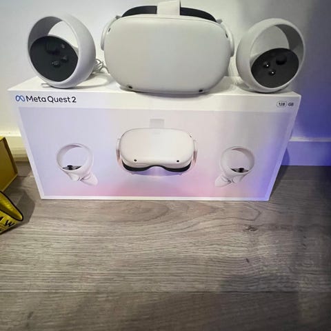 Meta Quest 2 VR headset med 256 GB lagerplads. Headsettet er hvidt og inkluderer tilbehør som controllere og remme.