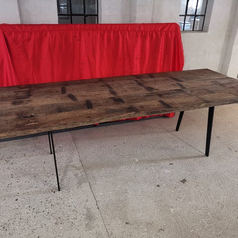 Flot plankebord. Bordpladen består af brede træplanker, og bordet har solide ben i samme materiale og farve.