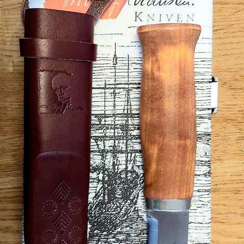 Skaftet er lavet af mørkt palisander, og serienummeret indgraveret på klingen. Det er nr. 23. Så meget tidlig udgave.