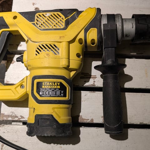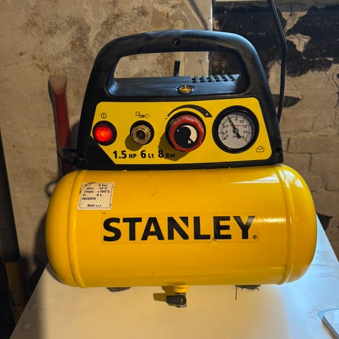 Stanley Fatmax 18V Inflator med 230 bar maksimal tryk, 230 l/min luftstrøm, 18V lithium-ion batteri, og ingen CO2-udledning. Designet til fleksibel strømforsyning med mulighed for brug af 230V netadapter.