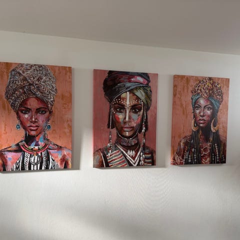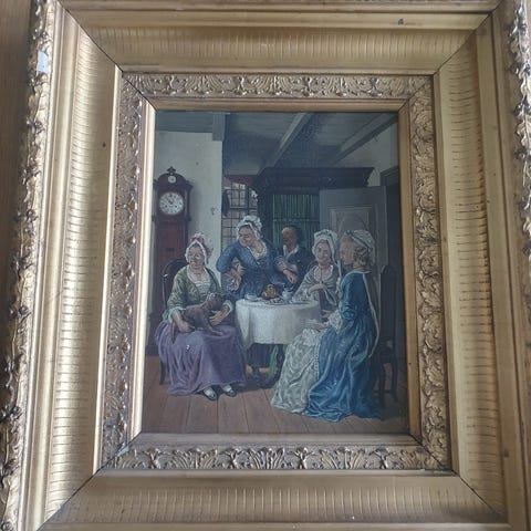 Maleri der forestiller fem kvinder iført kjoler i forskellige farver. Maleriet er indrammet i en træramme med glas. Motivet viser kvinder stående ved vandkanten.