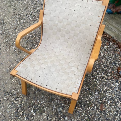 Klassisk lænestol fra Stouby “Albert” fra serien 3900. Designet af Finn Østergaard. Gjorde i natur og stel i bøg. Har mærker af maling enkelte steder og enkelte pletter på gjorde, hvilket prisen afspejler, men den er stadig rigtig fin.