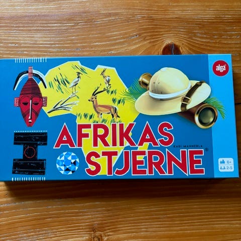Afrikas Stjerne brætspil er et familiespil, der involverer jagt på diamantmineraler. Spillet indeholder et spillebræt med forskellige elementer, herunder diamanter, et elefantmotiv og farverige illustrationer. Det er designet til 2-4 spillere og anbefales til aldersgruppen 5-12 år.