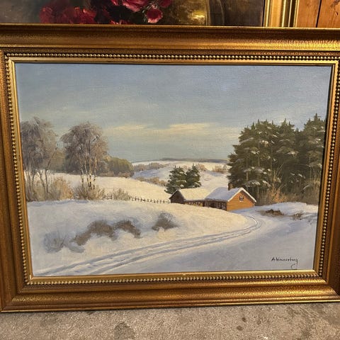 Maleri forestillende en kvinde iført en bredskygget hat og en rød kappe. Maleriet er indrammet i en rustik træramme. Farverne domineres af rød, sort og beige nuancer.