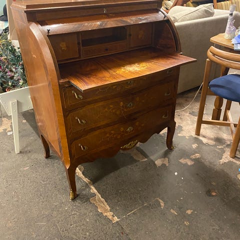 Antikt skrivebord med rullelåge i træ, designet med flere skuffer og opbevaringsrum. Inkluderer en tilhørende træstol med drejede ben og armlæn. Skrivebordet har en klassisk stil og er velegnet til kontor- eller studiemiljø.
