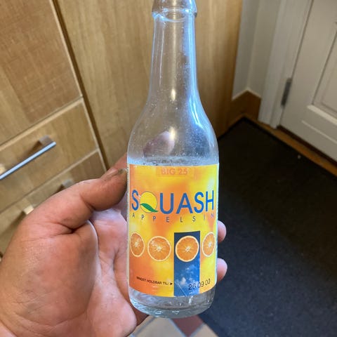 2 Meget gamle FDB flasker med etiketter og prop, hvor den ene er knækket.