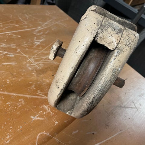 Gammel taljeblok med krankrog formentlig anvendt på sejlskib