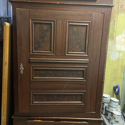 Det har lidt patina og mindre skader (se de sidste billeder), men det er ikke noget der ses når det står malet op. Der kan medfølge en rest af malingen såfremt man ønsker at bevare det i samme farve.