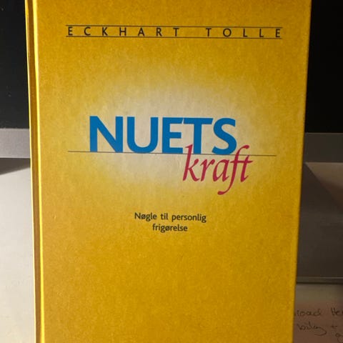 Eckhart Tolle Nuets Kraft bog med gult omslag. Bogen indeholder personlig vejledning og refleksioner. Udgivet af Borgens Bogklub.