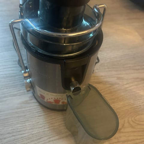 Severin Juice Master juicer i rustfrit stål og sort plast. Designet til at presse juice fra frugt og grøntsager. Udstyret med låg, saftudløb og låsearm for sikker brug.