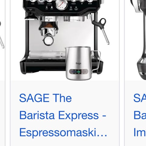 Sage Barista Express espressomaskine i rustfrit stål. Udstyret med integreret kaffekværn, trykmåler og dampstav til mælkeskumning. Velegnet til tilberedning af espresso og mælkebaserede kaffedrikke.