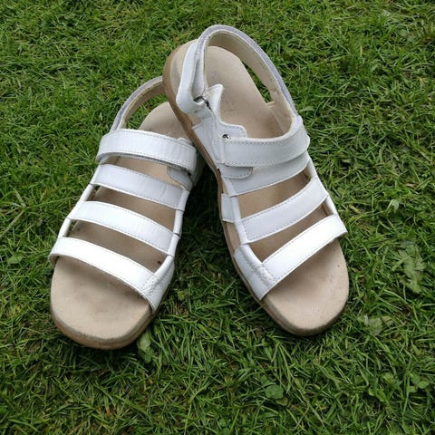 Hvide damesandaler med god svangstøtte. To remme til regulering. Materialet er læder og kork. Mærket er Rathgeber. Kun brugt en gang. Fremtræder derfor som nye.