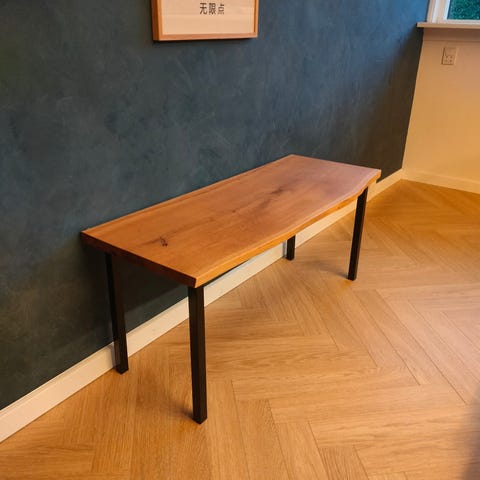 Bænk i massiv egetræ, mat lakeret. Længde 150 cm, højde 42 cm, dybde 39 cm, og træet er 2,5 cm i tykkelsen. Sorte stålben. I flot og som ny stand.