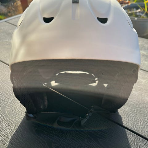 Uvex skihjelm i sølvgrå med ørevarmer og luftspjæld. Pæn med småskrammer. Str. XS-M 53-57 cm.