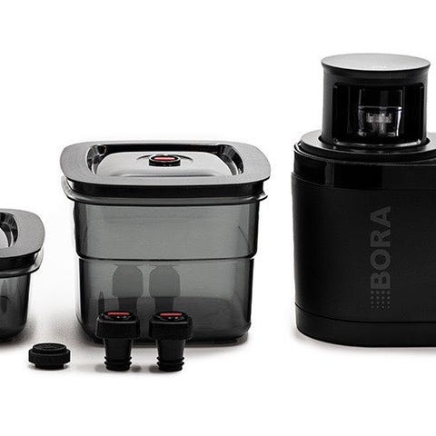 BORA vakuumforsegler med 4oo mm. slange inkl. tilbehør til opbevaring, herunder 15 vakuumposer og 2 opbevaringsbeholdere i gennemsigtigt materiale. 2 propper og 1 marineringsring. Designet til at forlænge holdbarheden af madvarer ved at fjerne luft. Fritstånede bordmodel, sort. Normalpris 4.995,-