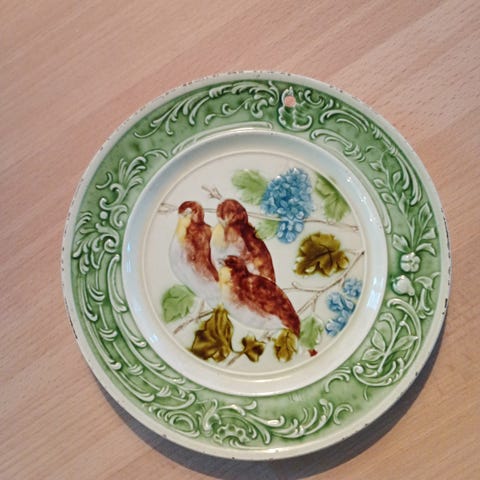 Den dekorative glaserede keramiske platte er i blå, grønne og beige mønster.