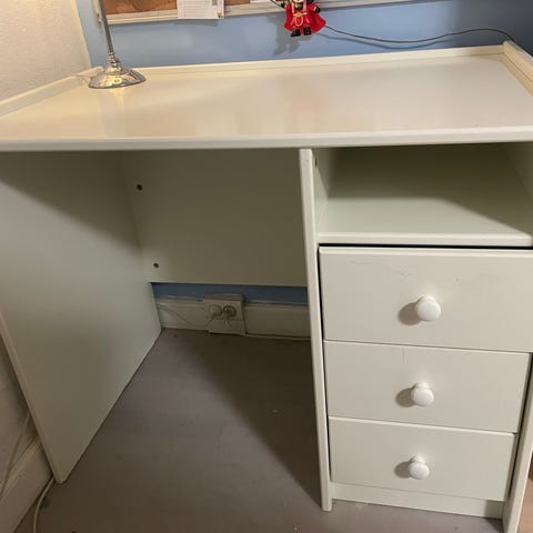 Fineste hvide skrivebord til børn. Pæn stand, men brugsmærker på bordpladen. Skuffer på alle sider med nemt udtræk. Læder håndtag. Designer ukendt. Passer til 6-12 årige. Passer til piger og drenge.