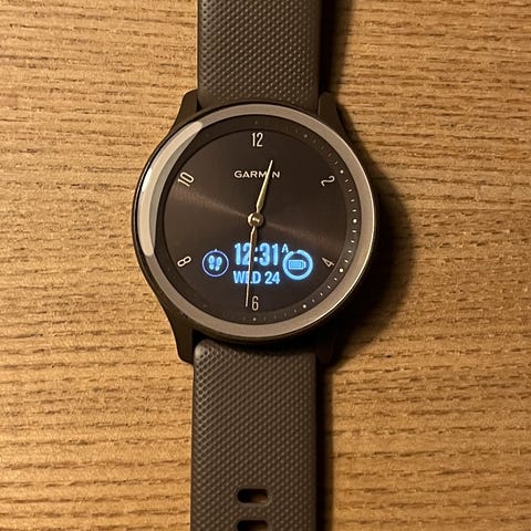 Garmin Vivomove 3S smartwatch med blå silikonerem. Uret har en rund urskive med analog visning og indbygget aktivitetsmåler. Inkluderer opladningskabel og original emballage.