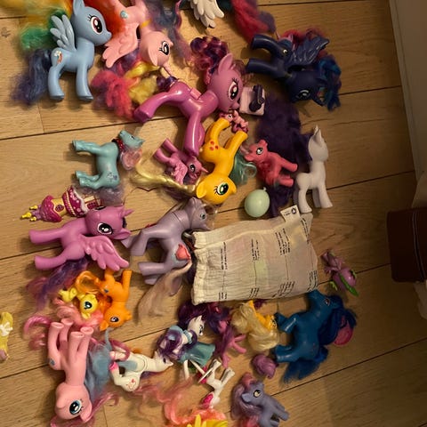 My Little Pony børnelegetøj bestående af flere figurer i forskellige farver og størrelser.